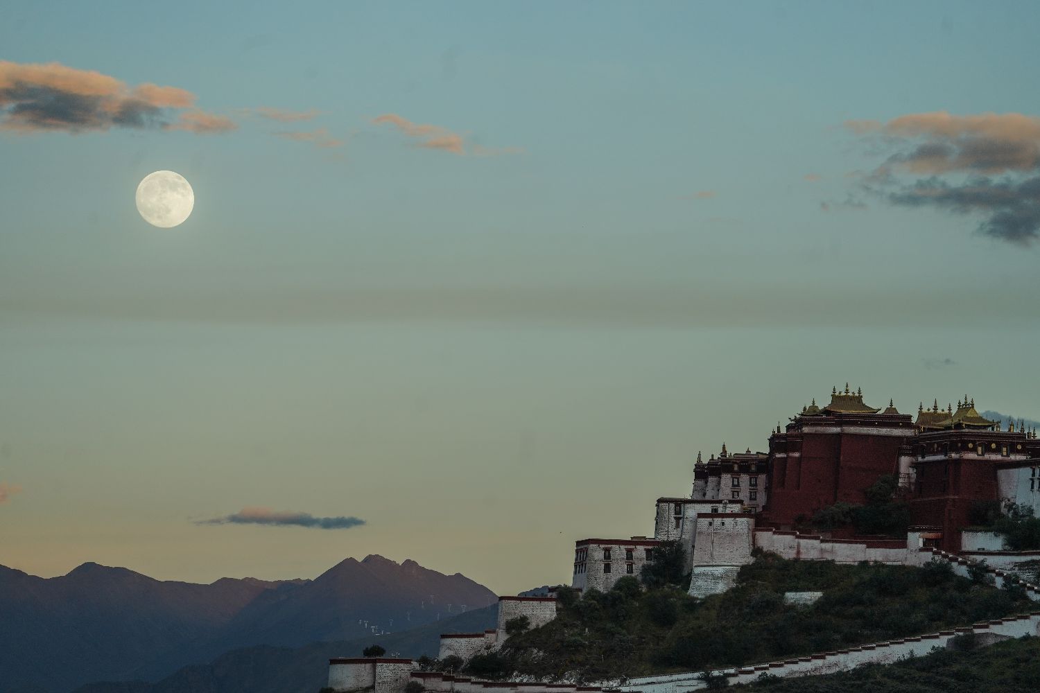 10月6日,西藏拉萨,布达拉宫与圆月同框。(中新社)