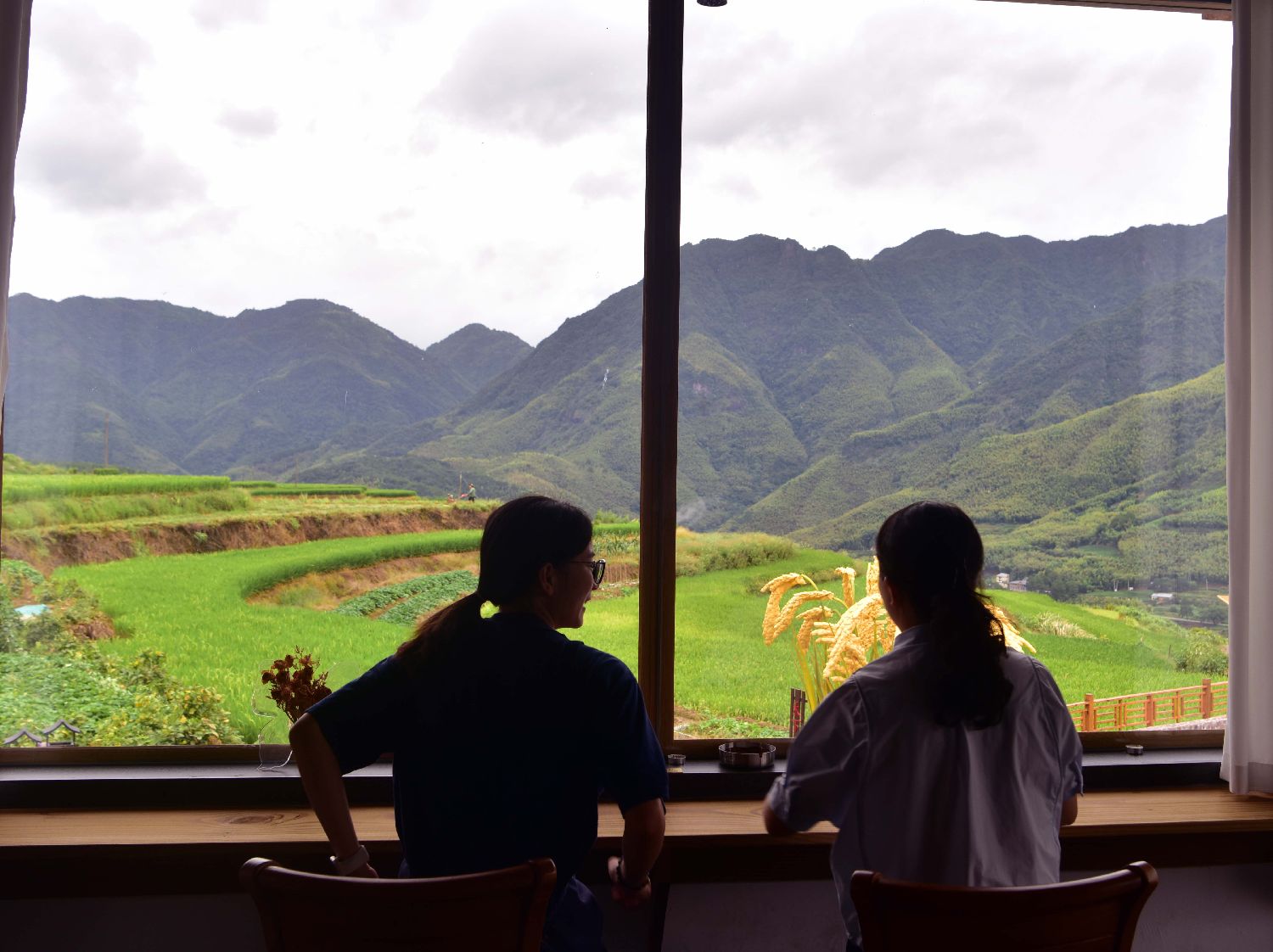 9月24日,游客坐在闽北念山梯田村咖边喝咖啡边看梯田美景。(图/中新社)
