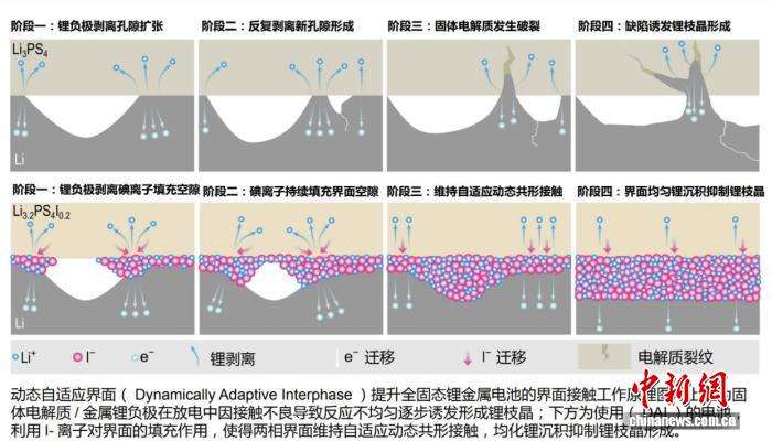 为解决这一难题,研究团队开发出一种在硫化物电解质中引入碘离子的新技术:电池工作时,这些碘离子会在电场作用下移动至电极界面,形成一层富碘界面。这层界面能够主动吸引锂离子,像“自我修复”一样自动填充进所有的缝隙和孔洞,从而让电极和电解质始终保持紧密贴合。
