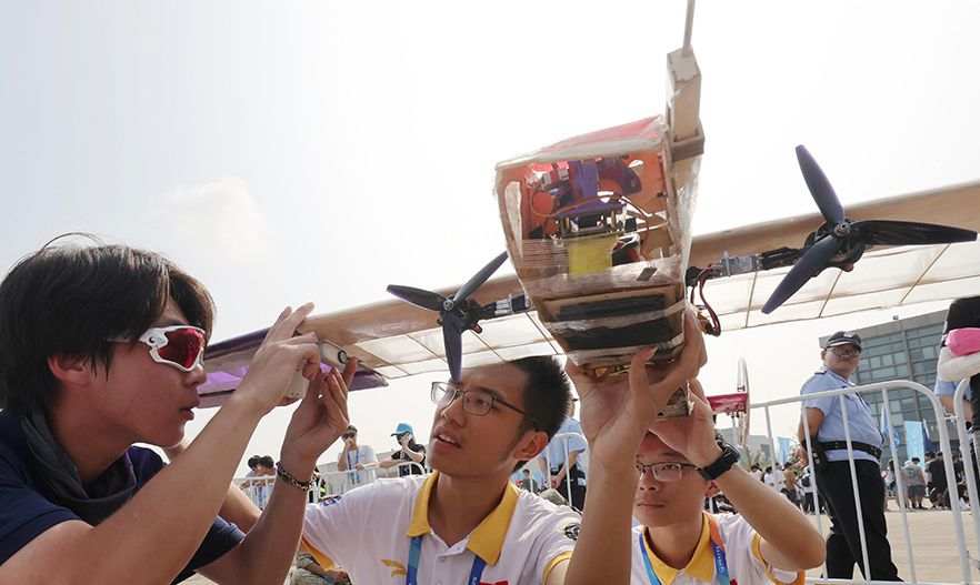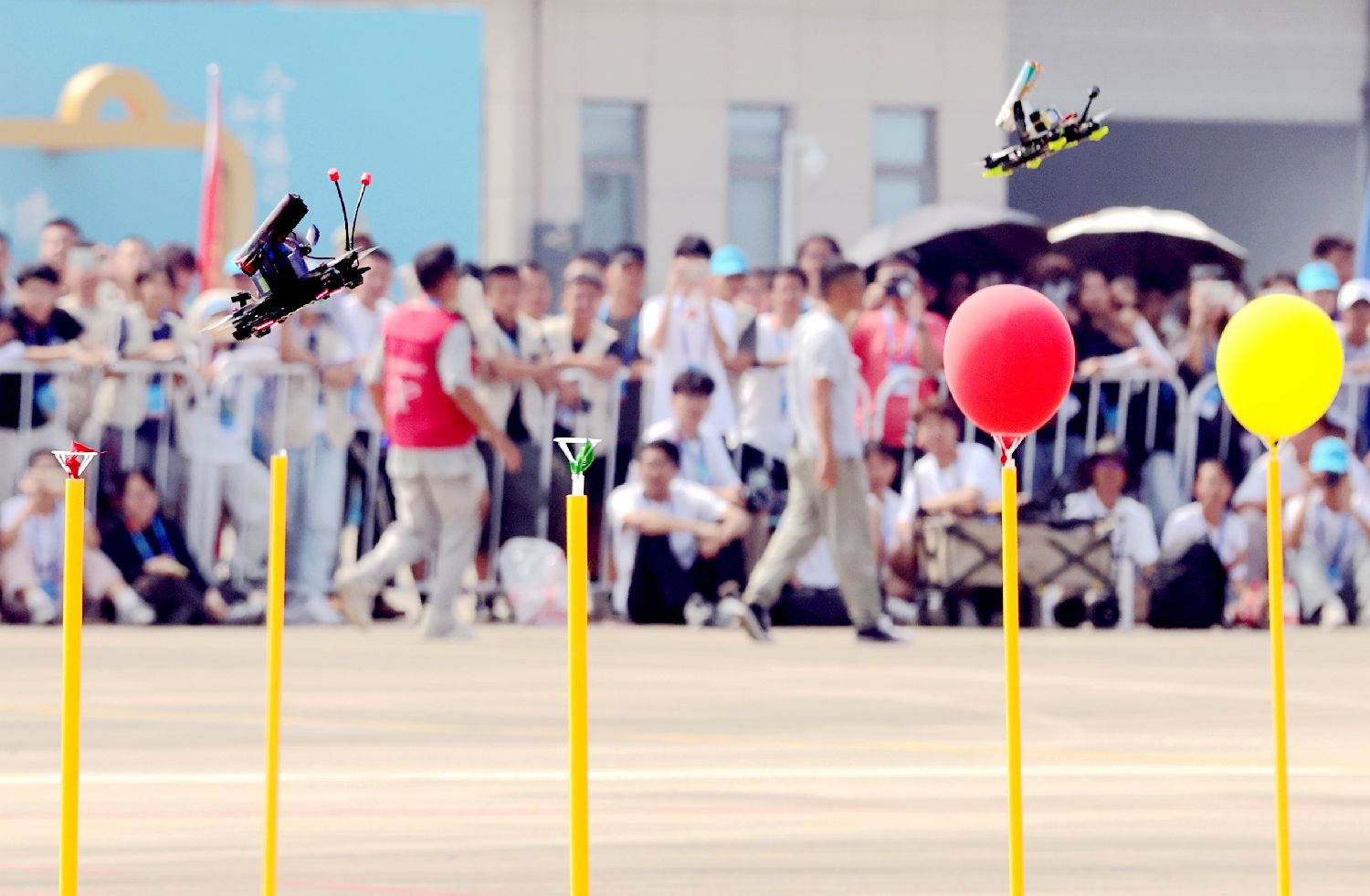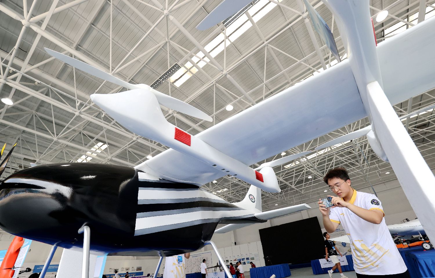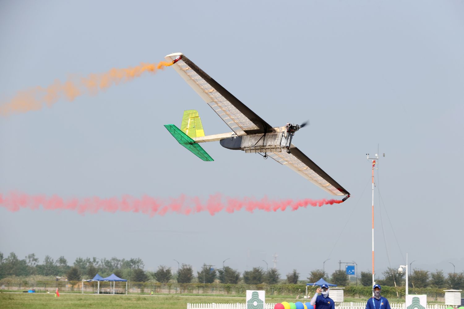 图为选手在进行飞行器飞行展示。(人民图片网)