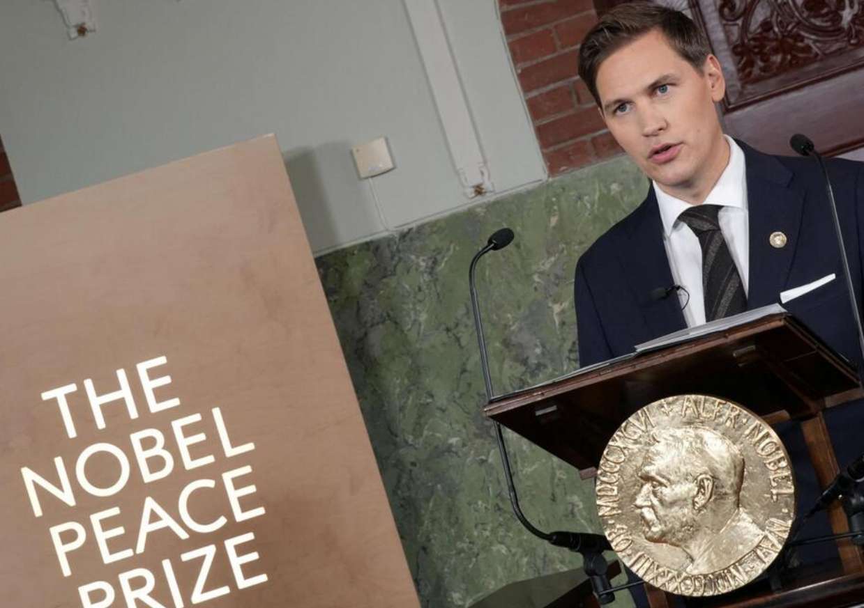 挪威诺贝尔奖委员会主席弗吕登内斯宣布和平奖获奖者 图源:日本共同通讯社