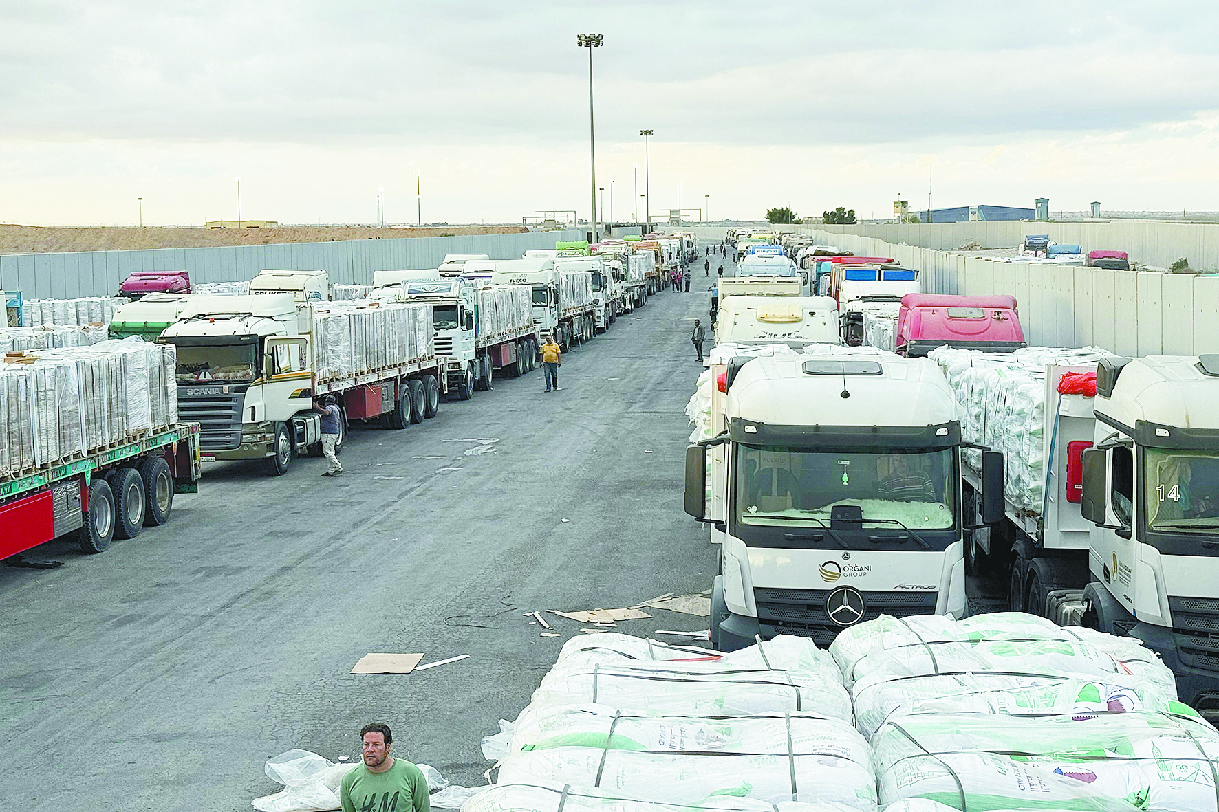 12日,运载国际人道主义救援物资的卡车停靠在拉法口岸埃及一侧,等待进入加沙地带。(视觉中国)