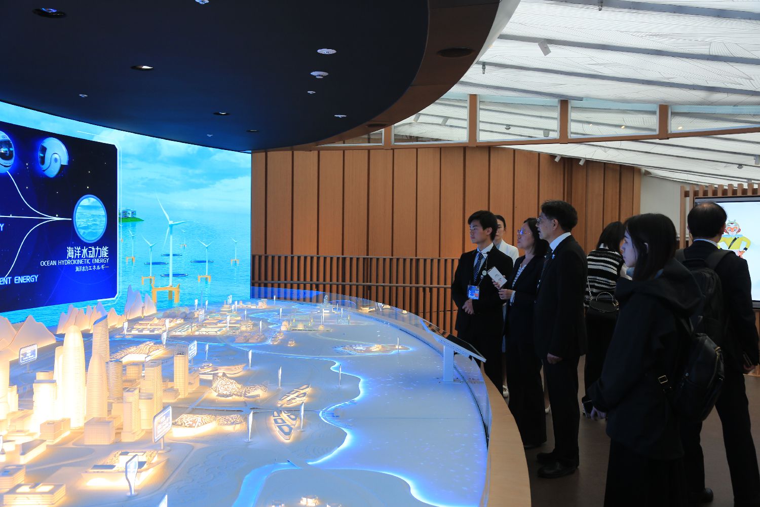 图为参观者在中国馆内参观“八网融合”智慧城市沙盘展项。(图/中新社)