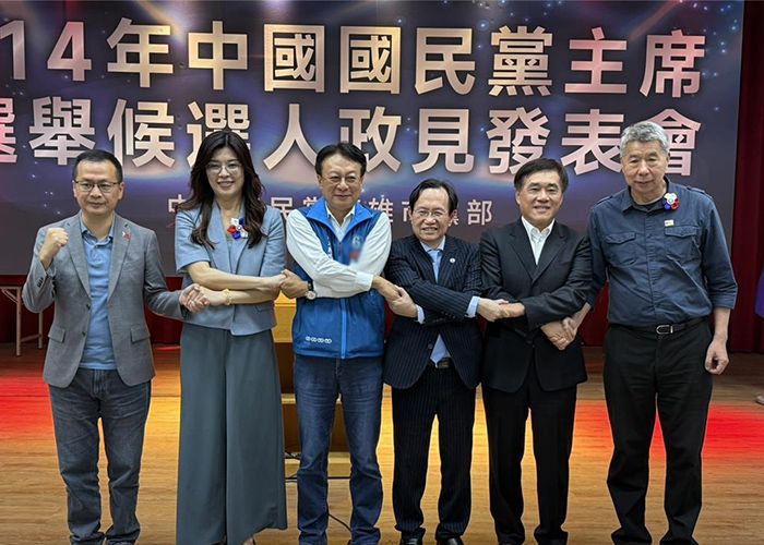 国民党12日在台北举行党主席选举政见发表会,左起罗智强、郑丽文、卓伯源、蔡志弘、郝龙斌、张亚中出席并展现团结。(图/台北中时新闻网)