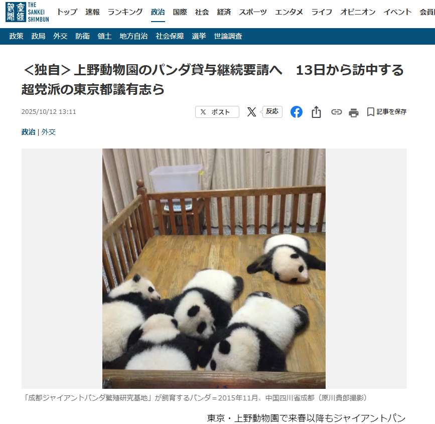由多位东京都议员组成的代表团于13日起访问中国,并将请求中方继续向上野动物园租借大熊猫。(图/《产经新闻》报道截图)