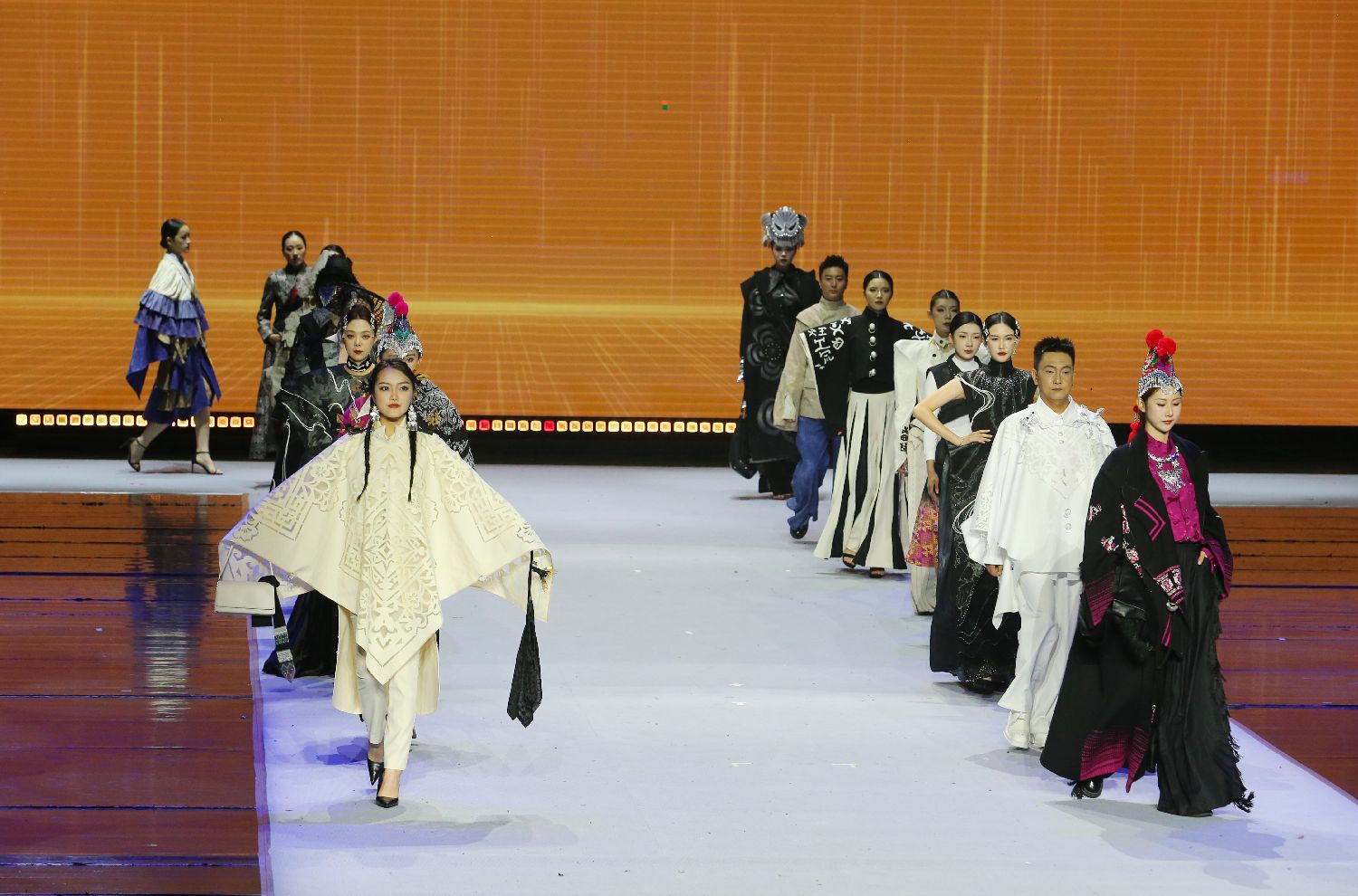 第三届楚雄时装周·中国国际时装周启幕演出以“千年赛装”“丝路云裳”“美美与共”“世界共享”四大篇章徐徐展开,通过一系列精美的服装服饰展演和动人的歌曲演绎,生动展现了古老非遗与现代时尚的完美融合与深度对话。图为走秀现场。(新华社)