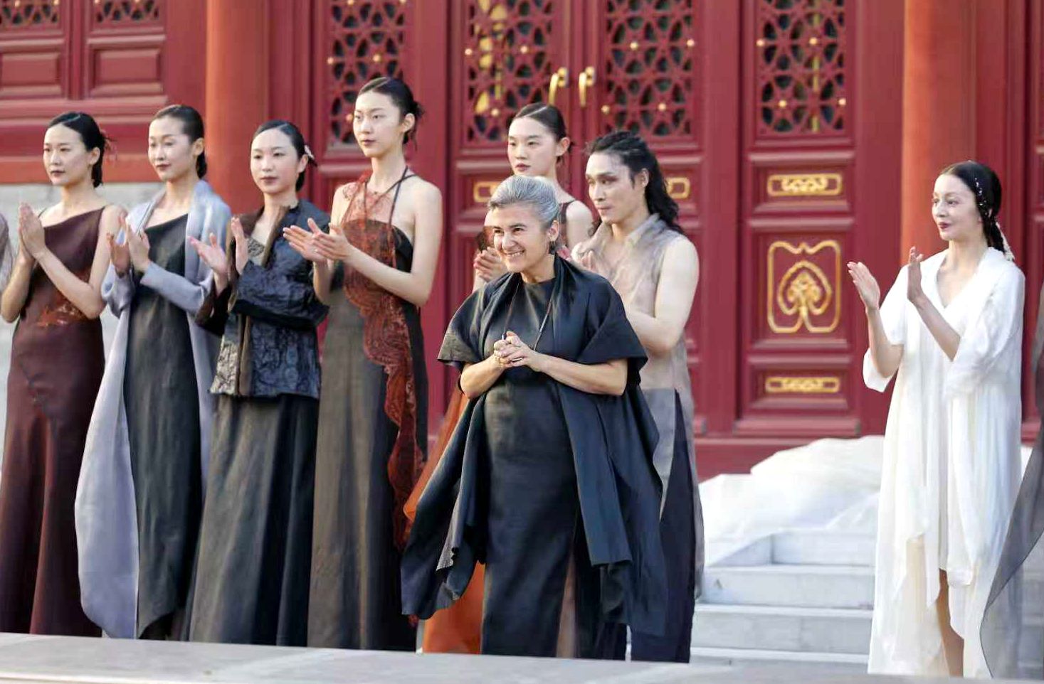 2025年9月12日,凯瑟琳·冯·瑞里博在T台秀结束后向观众致谢。多年来,凯瑟琳深耕中国传统面料尤其是香云纱的创新应用。她多次在广东顺德研究莨绸染色工艺,更将工作室长期设于北京,持续探索中西纤维艺术融合的新可能。(亚太快讯)