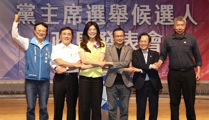 国民党主席选举候选人:(左起)卓伯源、郝龙斌、郑丽文、罗智强、蔡志弘、张亚中。(图/中央社)