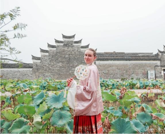 莱巴金娜身着中式服饰在荷塘前拍照留念。(图/中新网)