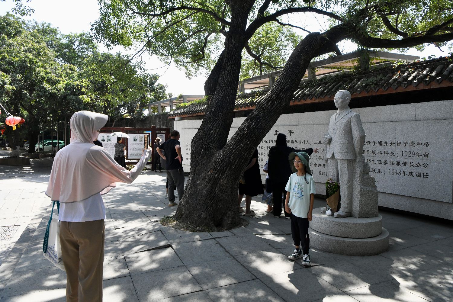 10月12日,小朋友和吴石雕塑合影。近日,随着电视剧《沉默的荣耀》热播,位于福建省福州市仓山区螺洲镇的吴石故居也随之成为民众追寻英烈足迹的打卡地。(图/中新社)
