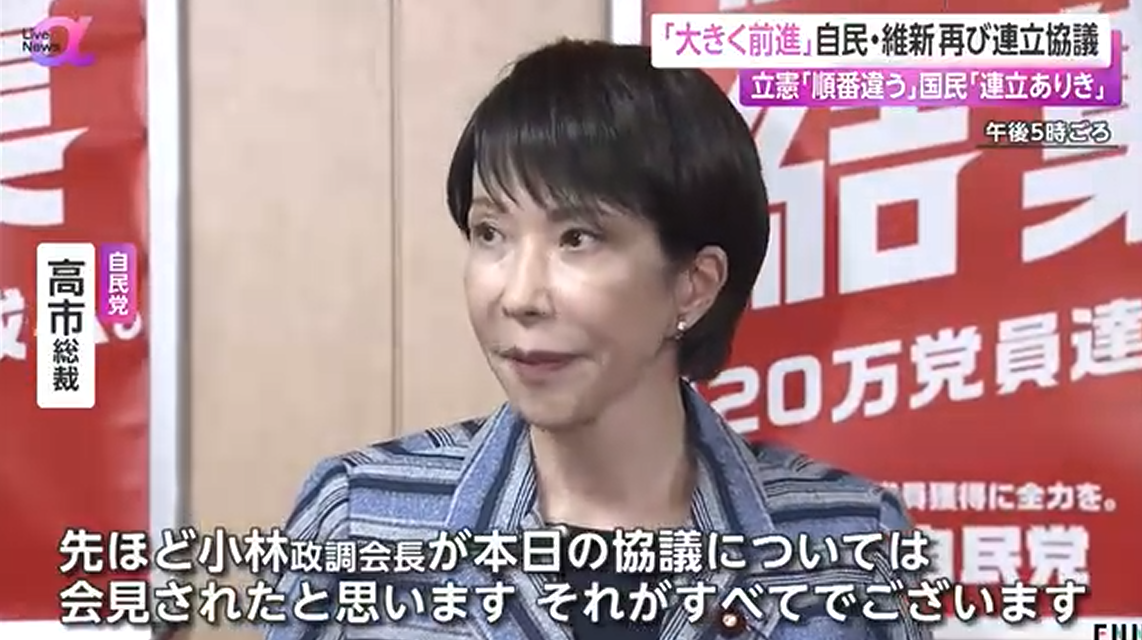 自民党政策调查会长小林茂树称,将在20日的最后期限前与维新完成最终磋商。自民党总裁高市早苗仅回应称,“一切以政调会的说明为准”。