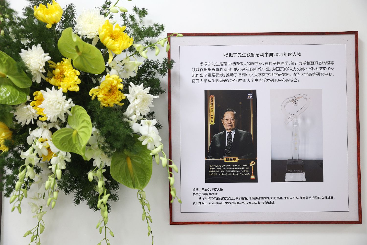 10月18日,清华大学校内设立的缅怀室门口挂着杨振宁先生获颁感动中国2021年度人物的介绍。(图/中新社)