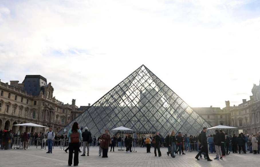图为大量游客22日聚集在卢浮宫博物馆的玻璃金字塔入口前。(图/新华社)