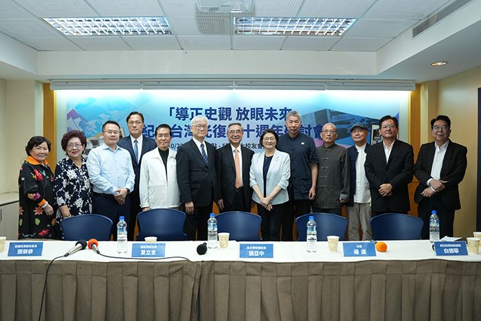 22日,由梅花媒体集团主办的“导正史观 放眼未来”纪念台湾光复80周年研讨会在台北登场。图为与会者合照。(图/台北梅花新闻网)