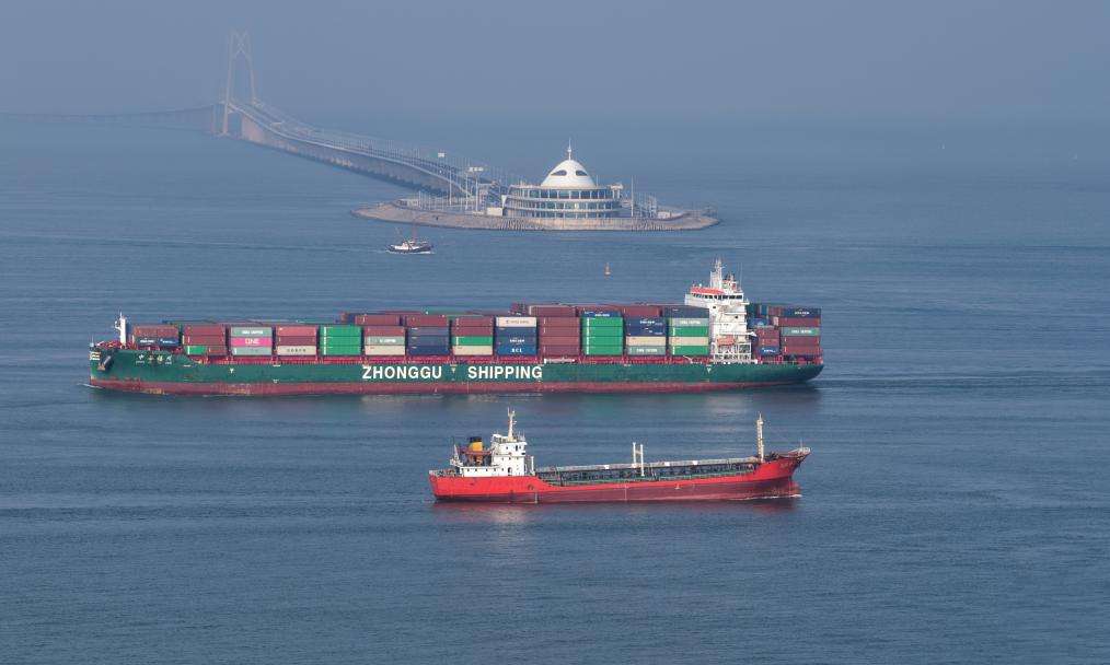 2025年10月19日,在伶仃洋主航道上的船舶驶过港珠澳大桥西人工岛。(新华社)