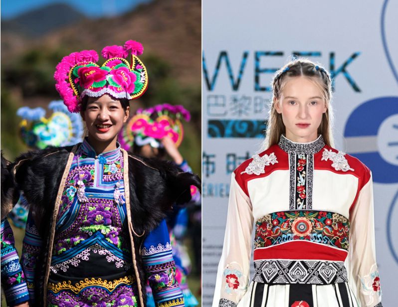 左图为一名年轻女孩在楚雄彝族自治州永仁县直苴村参加赛装节;右图为2024年9月26日拍摄的模特在法国巴黎举行的中国楚雄非遗服饰时装展上展示时装。(图/上海上观新闻)