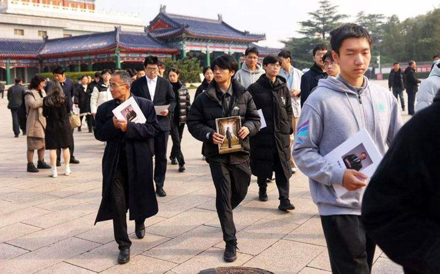 人们身着素衣,许多人手捧杨振宁先生的照片。(北京《新京报》)