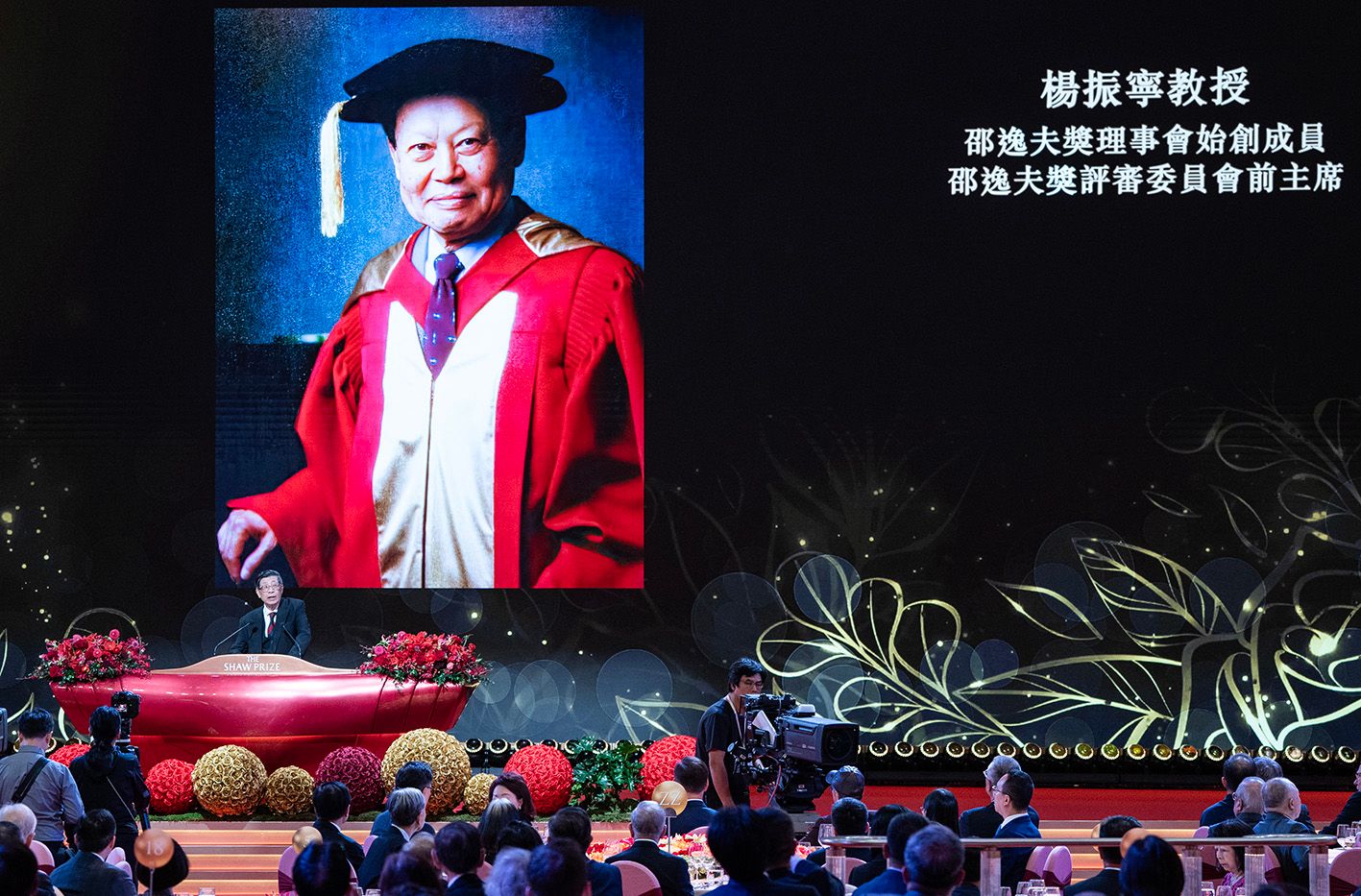 10月21日晚,2025年度邵逸夫奖颁奖典礼在香港会议展览中心大会堂举行。图为邵逸夫奖理事会主席、评审会副主席杨纲凯代表理事会致辞缅怀已故的杨振宁。(中新社)