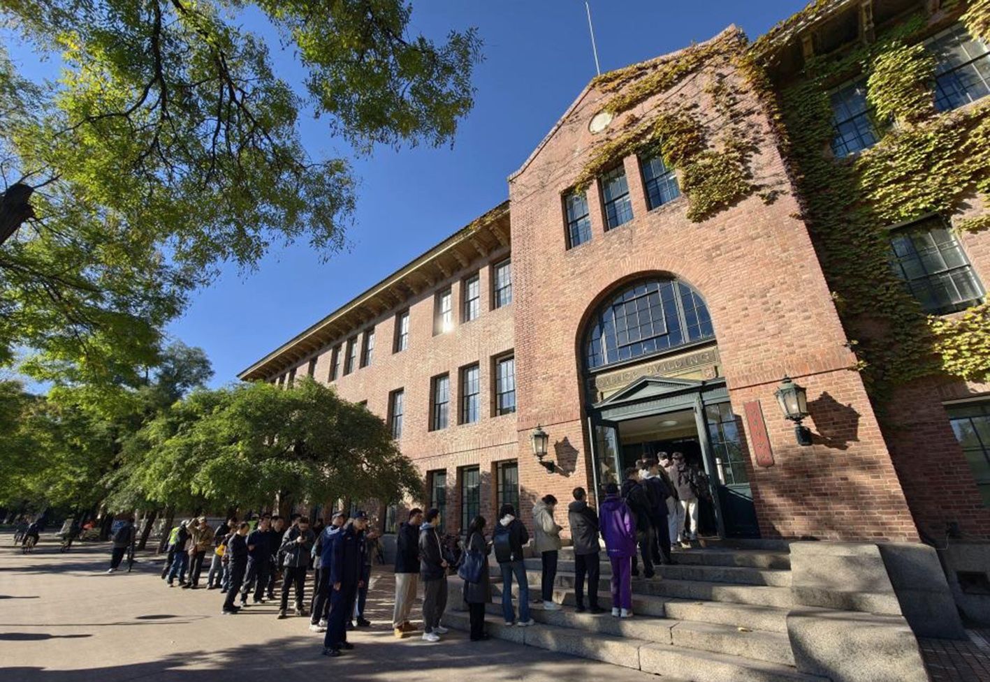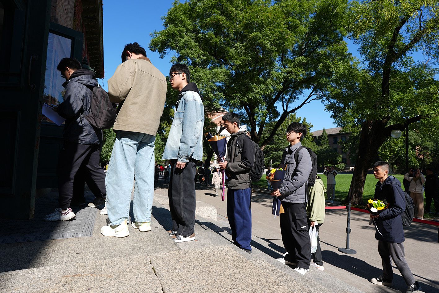 10月19日,民众及清华大学师生排队进入缅怀室。为深切缅怀杨振宁先生,清华大学高等研究院在校园设立杨振宁先生缅怀室,于2025年10月18至24日期间,接受各界友好人士吊唁。(中新社)