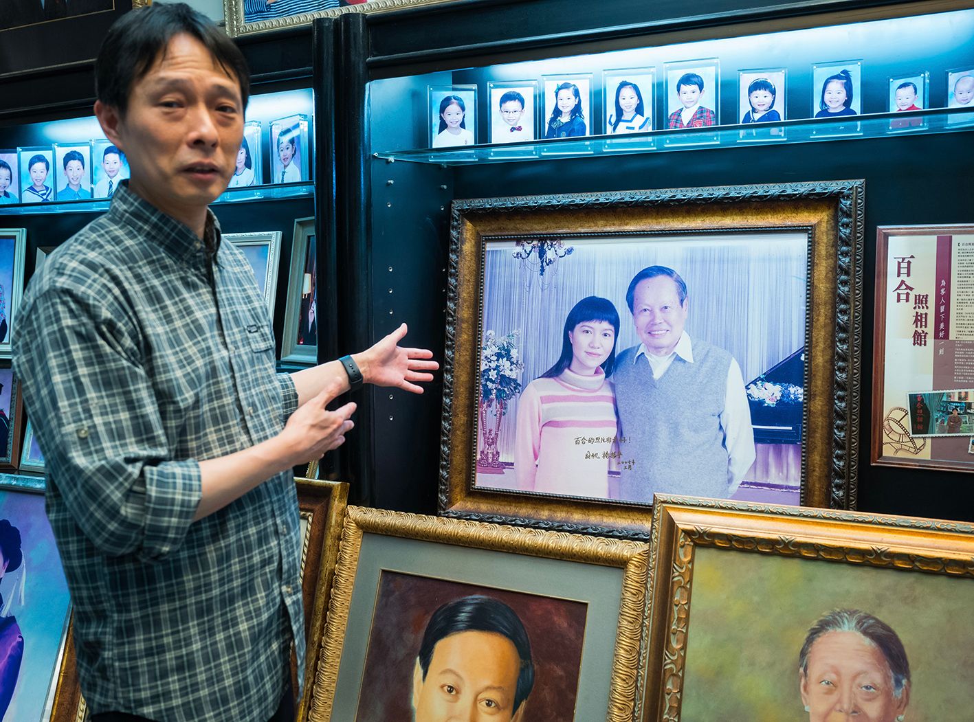 10月19日,位于香港沙田的百合照相馆,店主严子龙介绍店内展示的有杨振宁2007年签名的照片。杨振宁在港期间,曾多次前去拍摄照片。(中新社)
