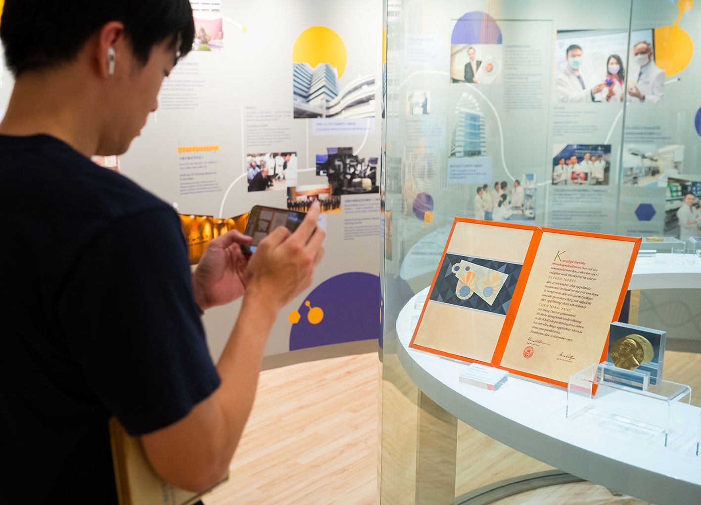 10月19日,来访者在香港中文大学校史馆内参观杨振宁获得1957年诺贝尔物理学奖的证书、奖章等展品。1999年,杨振宁将包括诺贝尔奖奖章在内的许多奖项、文章、信札、手稿等赠予香港中文大学。(中新社)