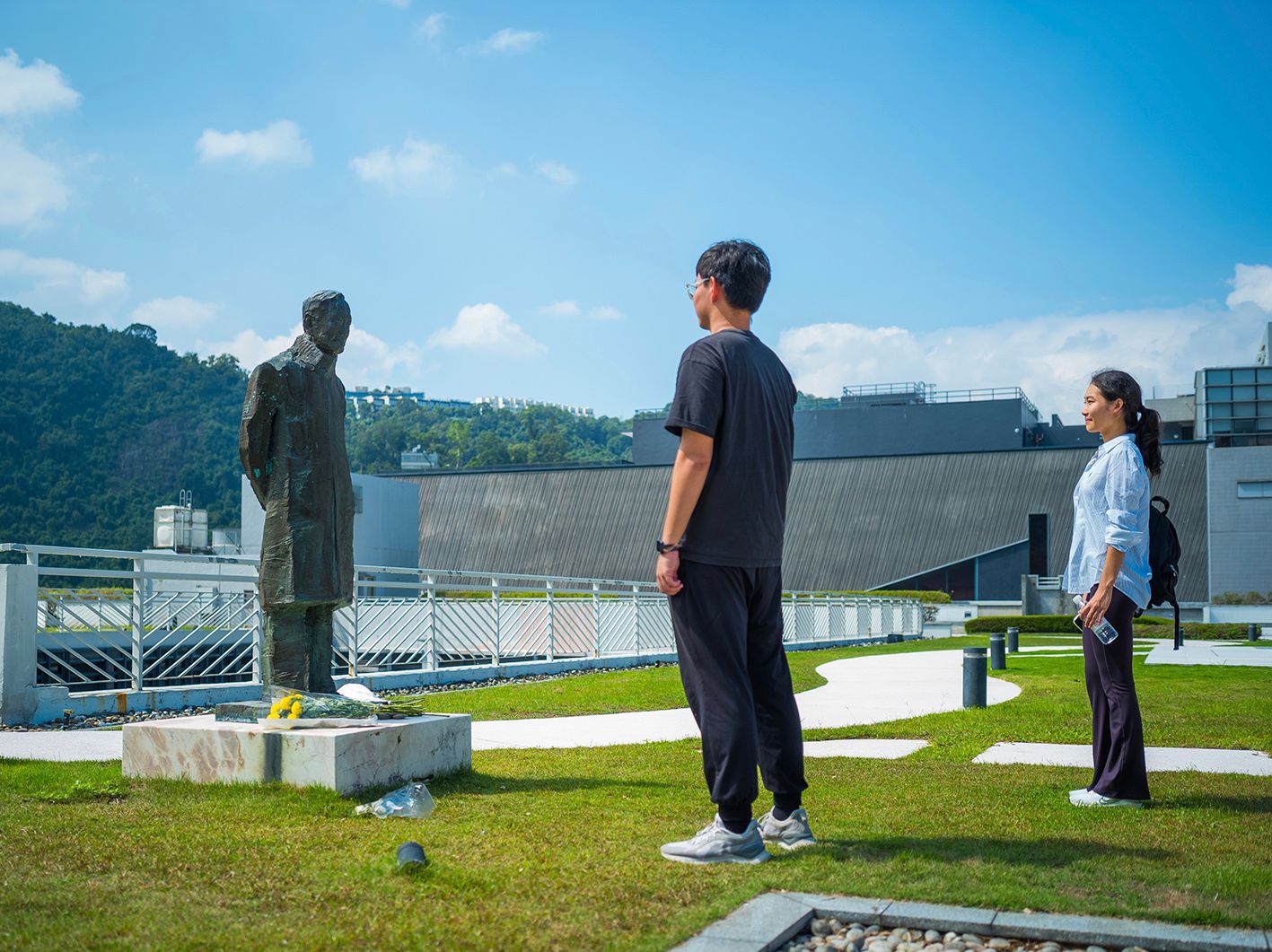 10月19日,学生在香港中文大学校园内瞻仰杨振宁塑像。2007年,为祝贺杨振宁85岁寿辰和荣获诺贝尔物理学奖50周年,香港中文大学在校园内树立该塑像。(中新社)
