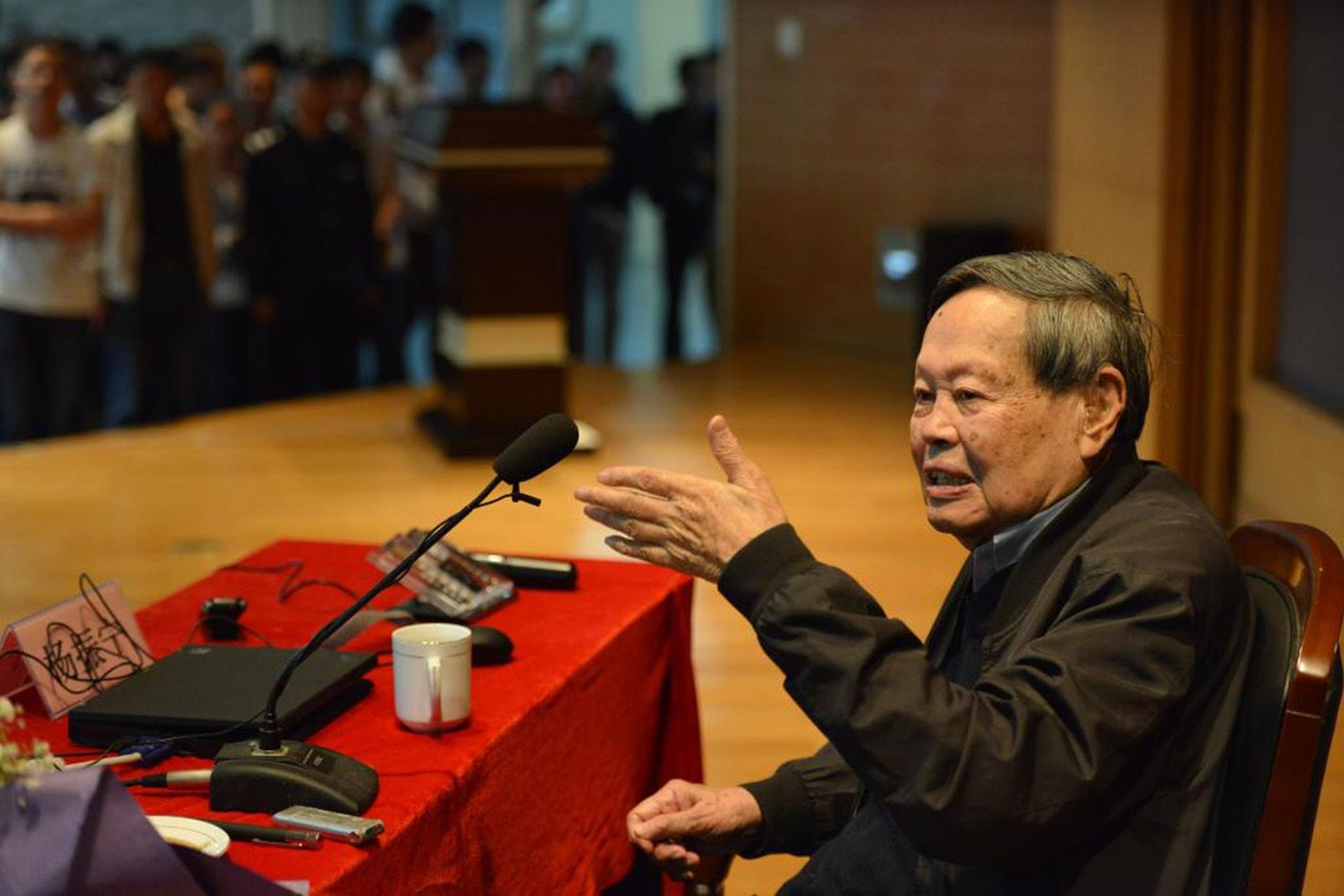 2014年4月14日,杨振宁在浙江大学演讲。(新华社)