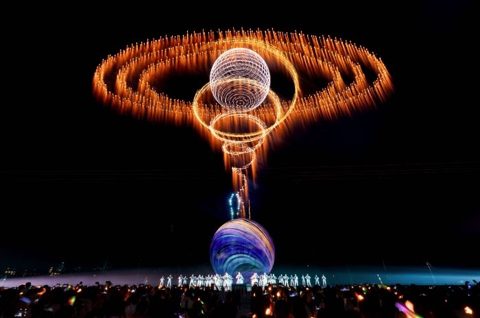 浏阳烟花从业者近年来深入研究“烟花+无人机”“烟花+多媒体艺术”等现代化表现形式,打造出“天空之门”等诸多令人震撼的烟花表演。当晚,现场又上演了“地球之心”“伞雨烟桥”“天上宫阙”“万马奔腾”等烟花演绎的夜空奇观。