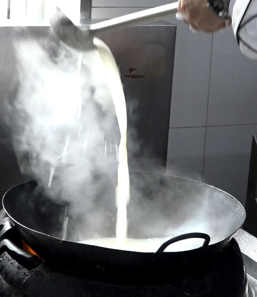 图为济南城南往事厨师尹明玉"溜汤"以增加奶汤的鲜味。(图/中新社)