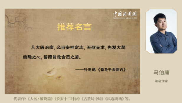 推荐名言:“凡大医治病,必当安神定志,无欲无求,先发大慈恻隐之心,誓愿普救含灵之苦。”——孙思邈《备急千金要方》