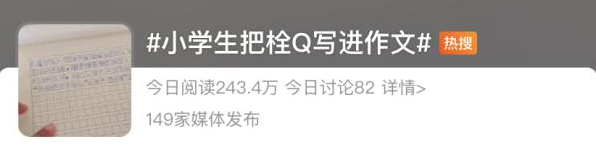 图为“小学生把栓Q写进作文”登上热搜。(图/微博截图)