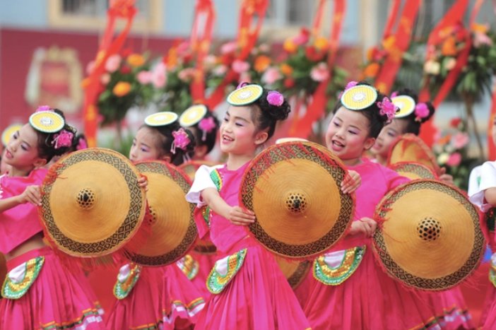 小朋友们手持花竹帽表演舞蹈。(图/新华社)