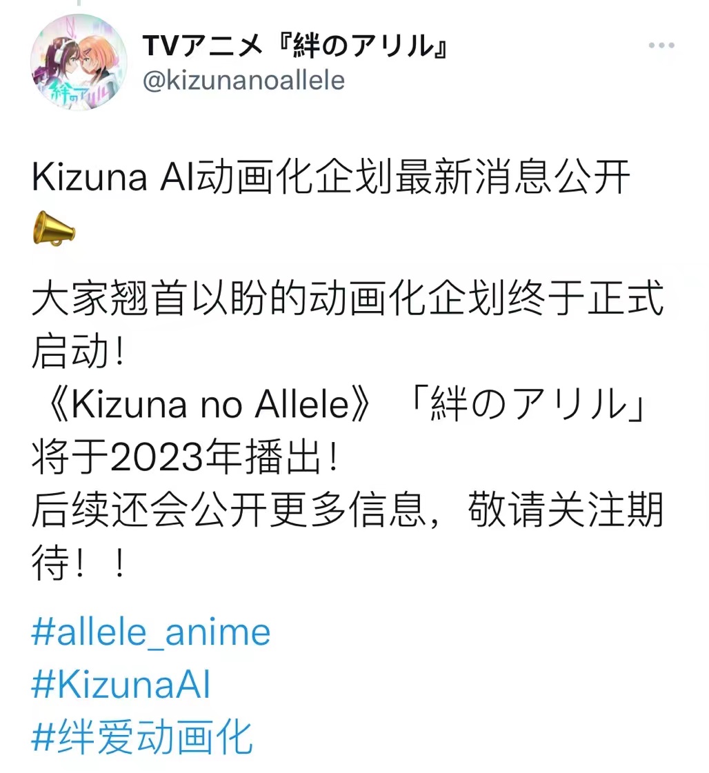 虽然大家无法再见到活泼可爱会和粉丝互动的爱酱了,但是,2023年,爱酱会在《Kizuna no Allele》中以动画的方式复活,再次与大家见面。