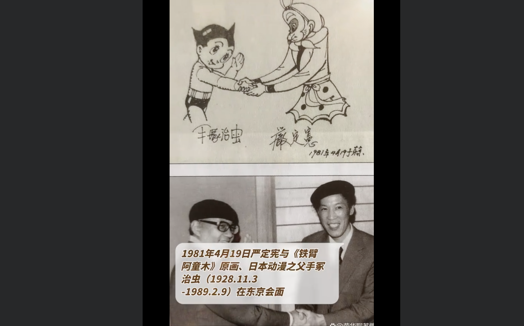 1981年4月19日严定宪与《铁臂阿童木》原画、日本动漫之父手冢治虫在东京会面。(图/视频截图)