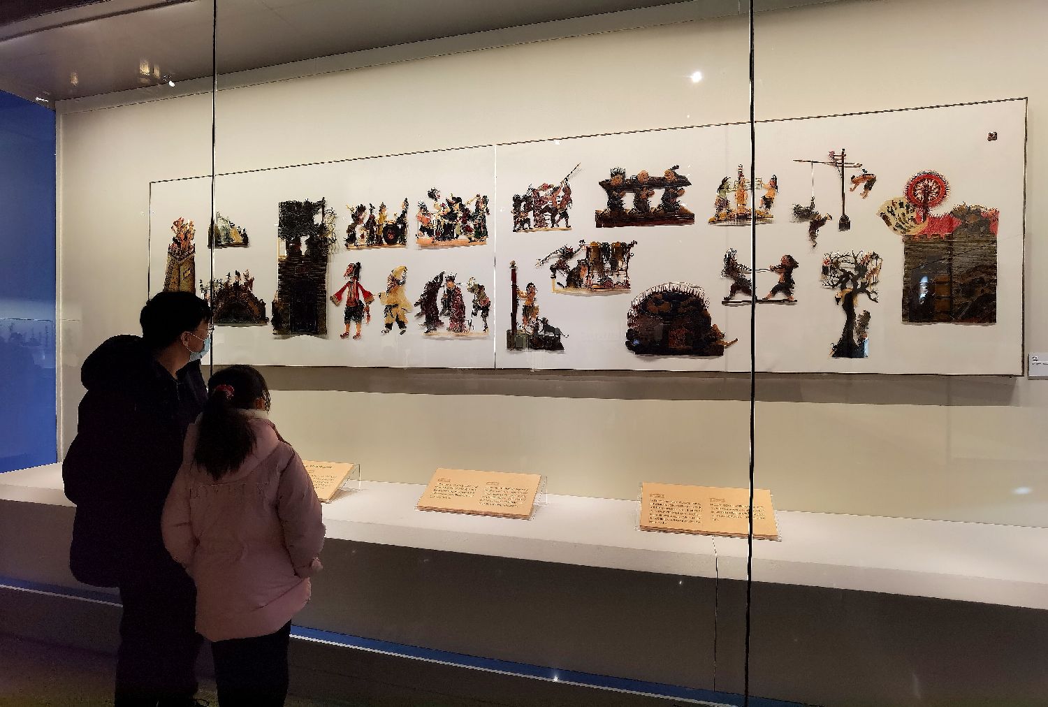 2023年1月24日,在中国工艺美术馆·中国非物质文化遗产馆的“影戏人间:陕西非遗皮影展”展厅内,共展出陕西非遗皮影相关展品约200件。图为游客在欣赏皮影作品。(日本头条万舒)