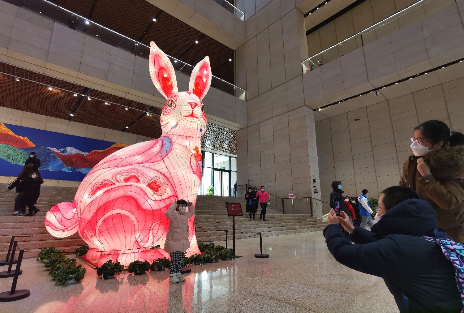 2023年1月24日,来自四川省自贡市的巨型非遗花灯“兔吉祥”“蹲”在博物馆大厅“迎候”游客,十分醒目,吸引众多游客打卡合影。2008年,自贡灯会被列入第二批中国国家级非物质文化遗产名录。(日本头条万舒)