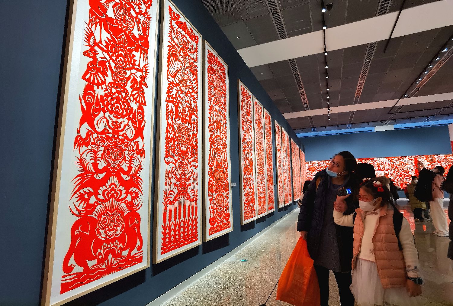 2023年1月24日,在中国工艺美术馆·中国非物质文化遗产馆的“太行之魂——张永忠剪纸艺术作品捐赠展”展厅内,游客正在欣赏剪纸作品。中国剪纸2009年入选联合国教科文组织“人类非物质文化遗产代表作名录”。(日本头条万舒)