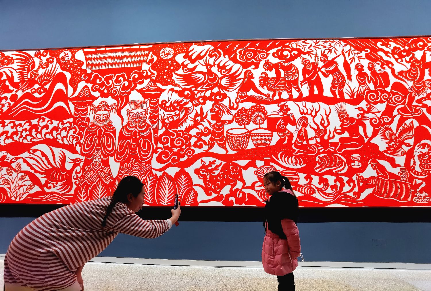 2023年1月24日,在中国工艺美术馆·中国非物质文化遗产馆的“太行之魂——张永忠剪纸艺术作品捐赠展”展厅内,游客在巨幅剪纸作品《中华炎帝魂》前给女儿拍照。(日本头条万舒)