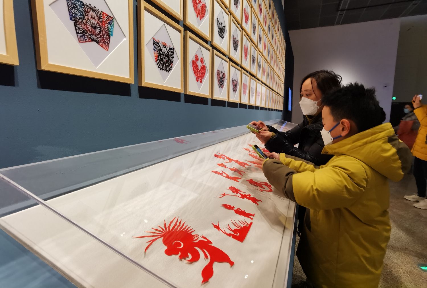 2023年1月24日,在中国工艺美术馆·中国非物质文化遗产馆的“太行之魂——张永忠剪纸艺术作品捐赠展”展厅内,游客正在拍摄剪纸作品。(日本头条万舒)