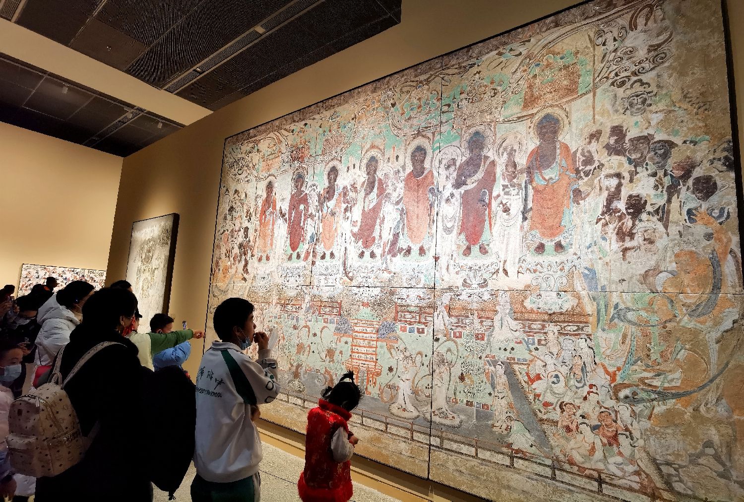 2023年1月24日,在中国工艺美术馆·中国非物质文化遗产馆的“丝路丹青——丝绸之路沿线壁画传摹”展厅内,游客正在欣赏敦煌莫高窟临摹壁画。(日本头条万舒)