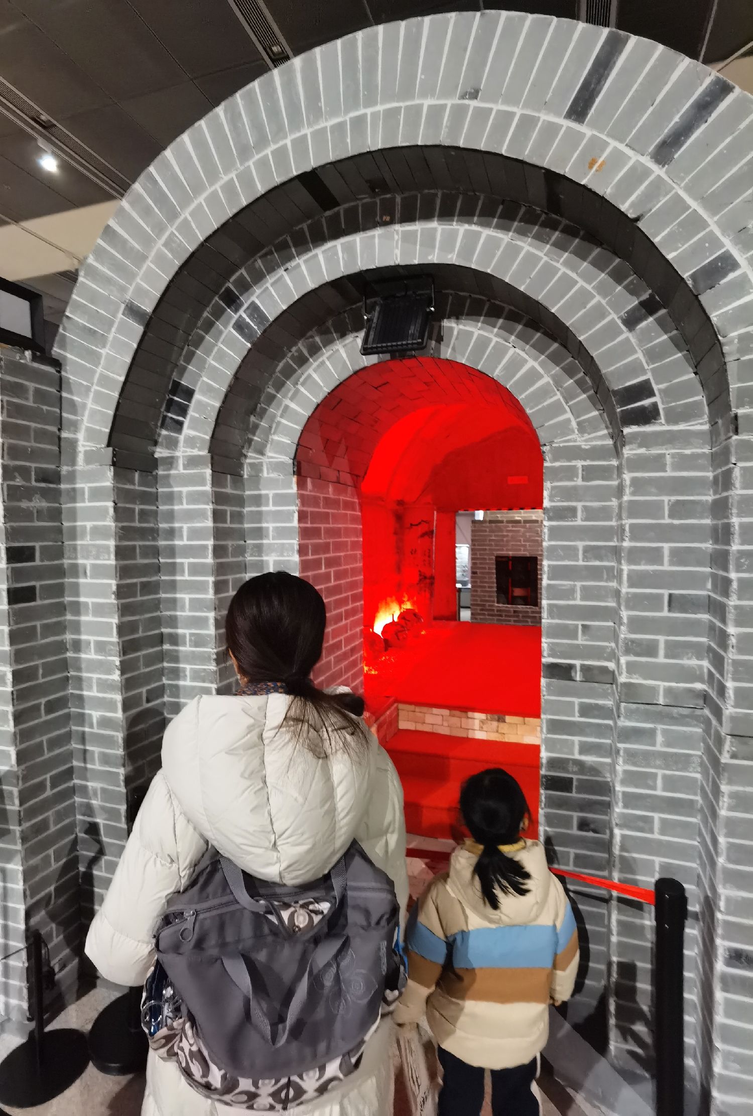 2023年1月24日,在中国工艺美术馆·中国非物质文化遗产馆的“松纳柴器——景德镇陶瓷柴窑烧造技艺展”展厅内,游客正在窑洞模型建筑前参观。景德镇传统瓷窑作坊营造技艺入选第一批中国国家级非物质文化遗产名录。(日本头条万舒)