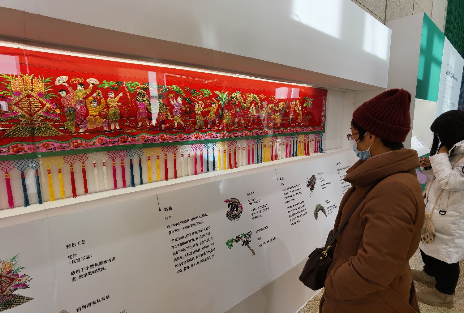 2023年1月24日,在中国工艺美术馆·中国非物质文化遗产馆的“粤绣年度成果展”展厅内,游客正在欣赏粤绣作品。粤绣是中国国家级非物质文化遗产。(日本头条万舒)