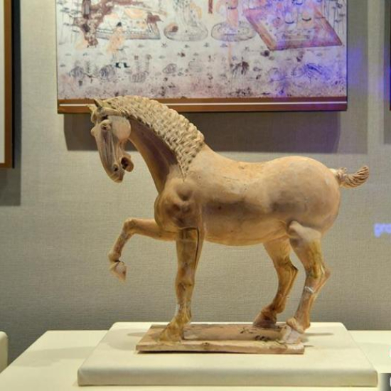 唐代是舞马发展顶峰时期。此次展览中,文物“白陶舞马”颇受关注。记者看到,舞马通体细腻如象牙一般,形体矫健,姿态优美。据悉,舞马表演起源于西方,魏晋南北朝时传入中原,是当时马戏表演的一种。经过训练的舞马可以随着音乐翩翩起舞,表演各种动作。