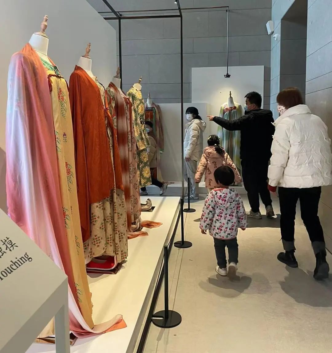 唐朝女性风华绝代,各种妆容、服饰都敢于尝试,展馆中一幅长卷图对初唐、中唐、盛唐、晚唐各个时期女性的妆发进行了艺术化复原。各种仿制的裙子摆放在显眼位置,或雍容华贵,或明丽娇俏,或英姿飒爽,参观的游客指着不同裙子说:“我喜欢这个。”