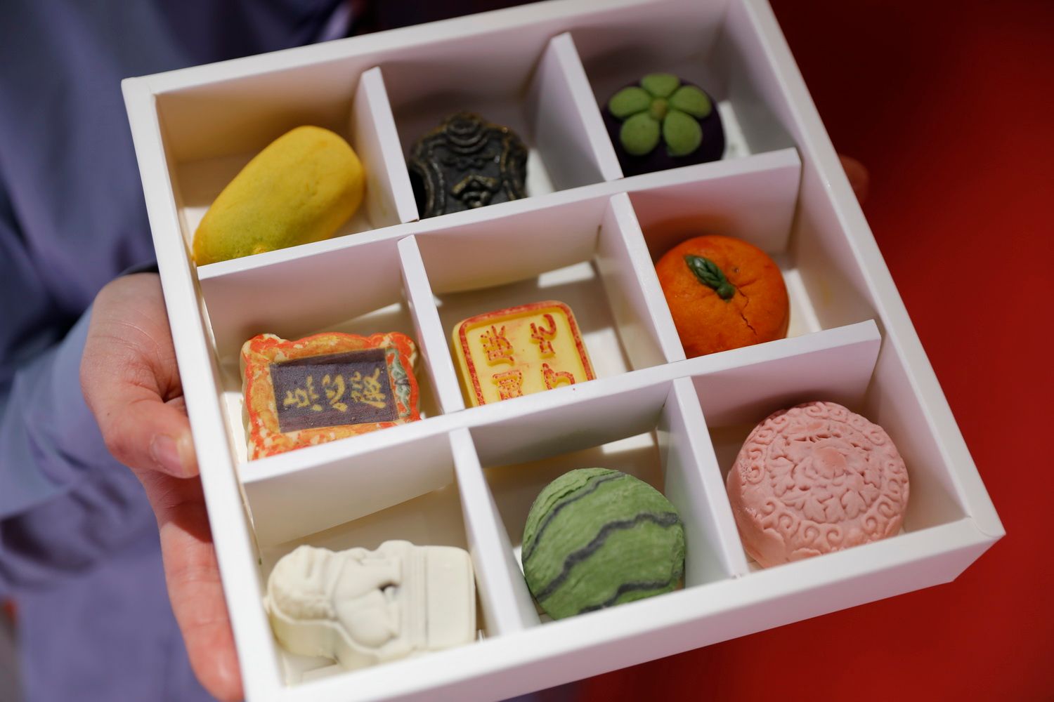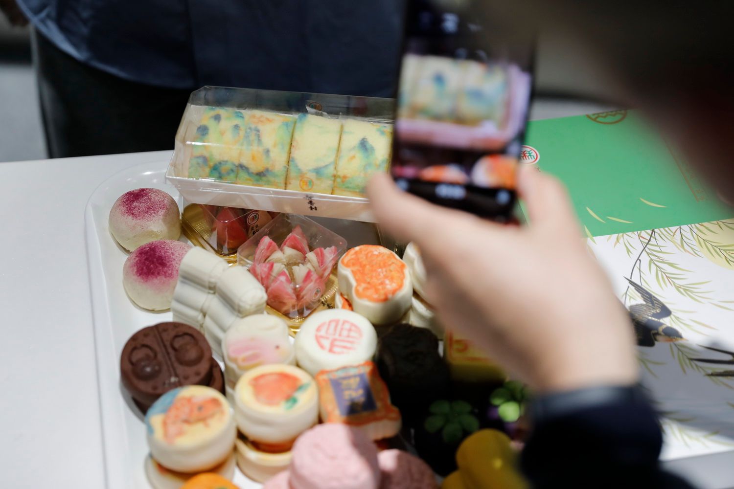 此外,“品味宫廷”系列的点心更是让现场顾客忍不住拍照分享,比如“点心殿”“玉玺糕”和“令牌酥”,芝士玫瑰味的“胭脂盒”做工精巧。“锦绣画卷”是在蛋糕卷上呈现出古画图案,笔墨浓淡间勾勒出山河美景。