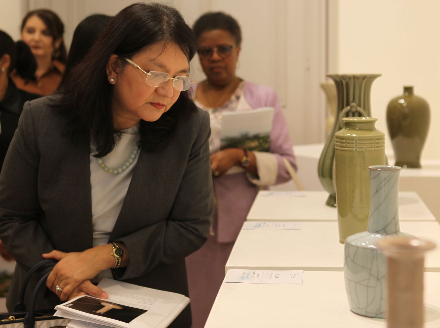 图为应邀出席开幕式的一名驻比利时使节夫人观展。(图/中新社)