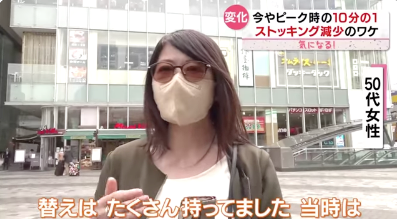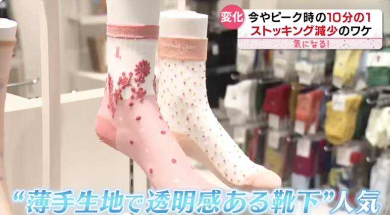 由于销售量的锐减,不少百货商店和超市的丝袜专区面积也减少了25%。不过,也有新的人气袜商品正在代替丝袜市场,就是颜色花纹都十分好看的透明感袜,这种笔者记得我们中国在90年代的时候在儿童袜中非常风靡。现在的商品自然是改良的更加精细美观了。这种透明感袜不被鞋子款式所制约,一般比较多的是搭配运动鞋,现在这类在日本也很有人气。50多岁的女性对此类透明感袜也十分青睐。
