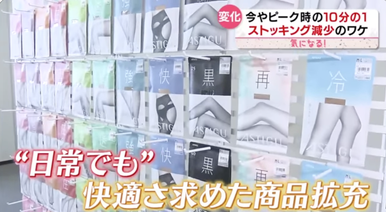 广泛年龄段群体时至今日,对丝袜的需求急剧减少。日本销售丝袜的大型生产商,正面临这样的巨大经营困境。一家经营丝袜商品70余年的大型袜业集团的开发部部长表示:“以前制服在礼仪上,必须搭配丝袜穿着,无论怎样都是一种规矩的约束。现在除了制服本身都在职场有所减少,女性的工作制服从裙装也从裤装等多样化风格发展。还有一个原因,就是由于疫情的长期存在,很多企业居家办公的普及,都是目前丝袜市场不景气的原因。”