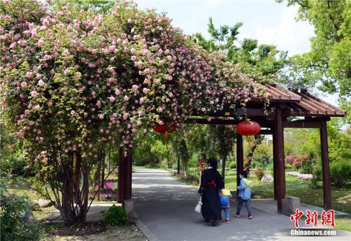 王国良用中国古代粉红香水月季设计营造的天地长春大型景观。(受访者供图)