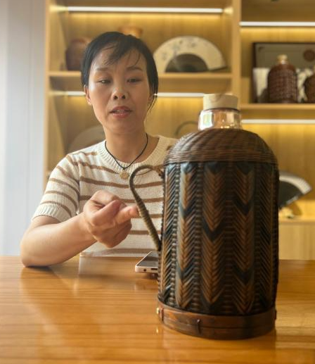 安徽省级非遗项目——高峰唐氏竹编第六代传承人唐圣丽正在介绍竹编暖水壶套。(图/中新网)